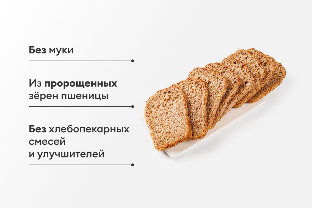 Цельнозерновой хлеб, выпеченный на дрожжах из пророщенных зёрен пшеницы по старинному рецепту. Без добавления муки. Идеален для приготовления утренних тёплых тостов, сытных сэндвичей и подачи к первым блюдам.
