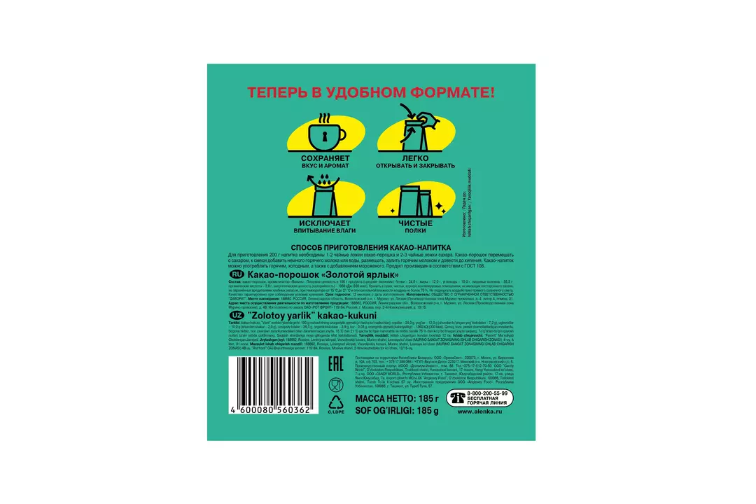 Какао-порошок «Золотой Ярлык» – самая знаменитая марка российского какао. Натуральный какао-порошок производит «Красный Октябрь» с начала ХХ века, и точно такой же порошок используется на фабрике при производстве шоколада и конфет. В домашних условиях «Золотой Ярлык» становится ароматным горячим шоколадом или молочным какао, глазурью для любимой выпечки. Яркий многогранный шоколадный вкус, сдобренный нотками ванили – для фирменных домашних десертов и кулинарных экспериментов. Страна-производитель Россия