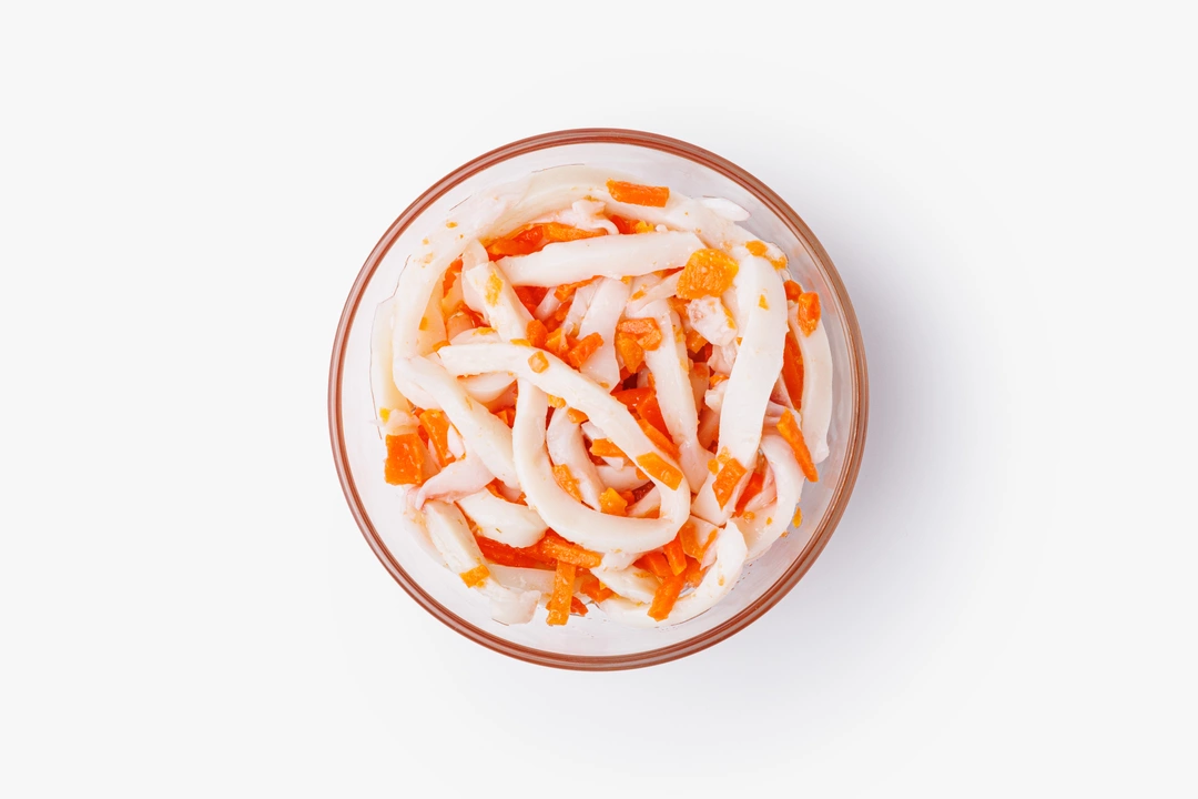 Пикантная закуска с ярким сочетанием текстур и вкусов. Нежное шинкованное мясо премиального кальмара гармонично дополняет сладковатая морковь с деликатной остротой и лёгкой кислинкой. Блюдо готово к употреблению и подойдёт в качестве самостоятельной закуски или дополнения к основному блюду.