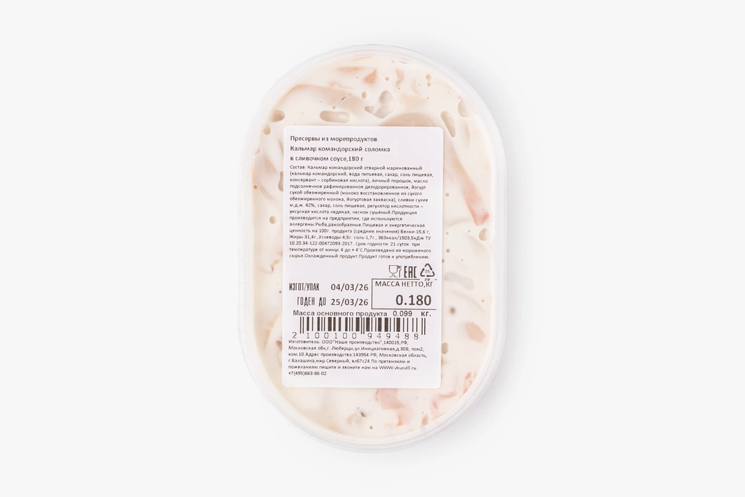 Кальмар командорский в сливочном соусе, 180 г