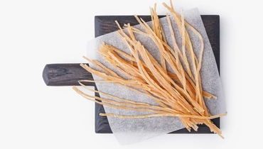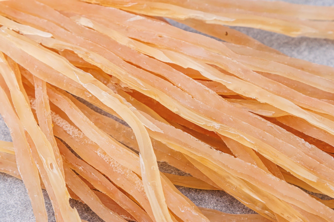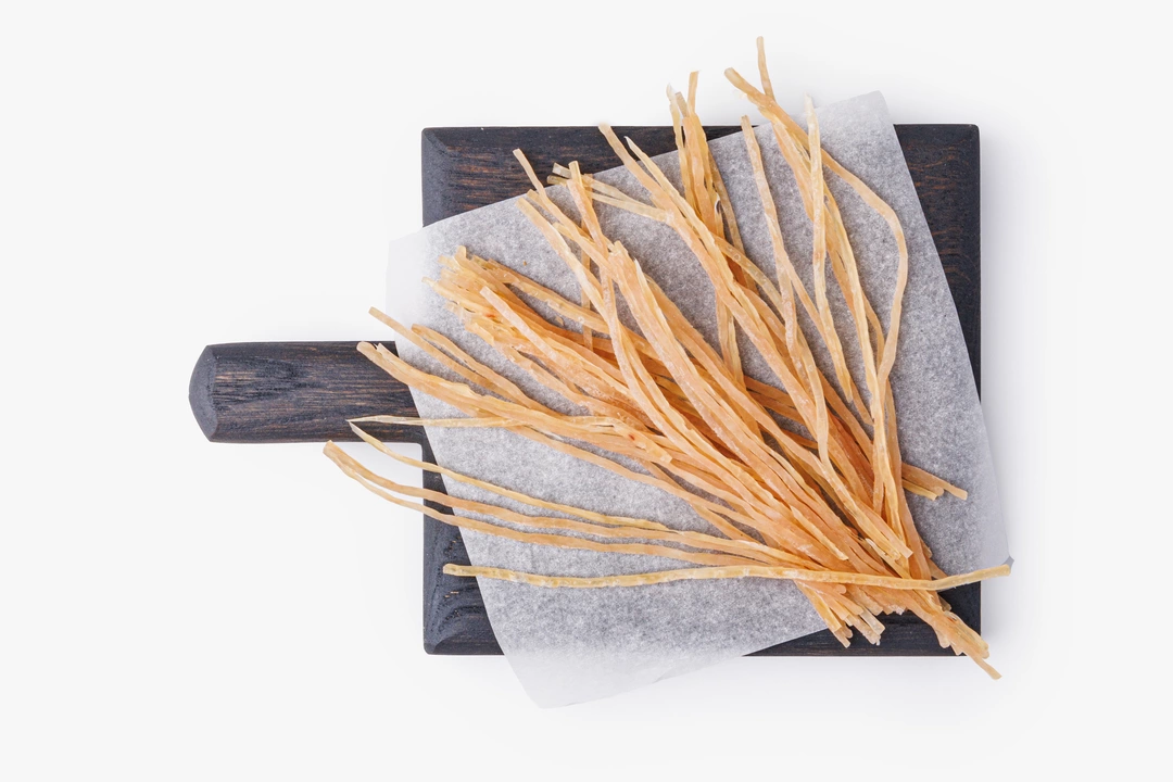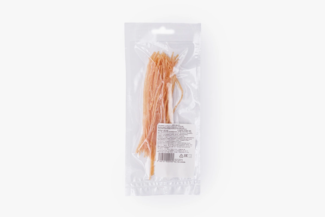 Тонкие полоски из тушек командорского кальмара. Нежное мясо аккуратно нарезали, приправили минимальным количеством специй и засушили. Паутинка сохраняет нежность, упругость и естественную сладость мяса моллюска. Её можно подавать в качестве самостоятельной закуски или в компании с напитками. Натуральный состав делает продукт интересной альтернативой традиционным снекам.