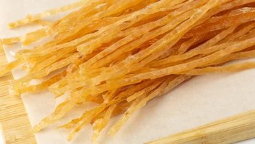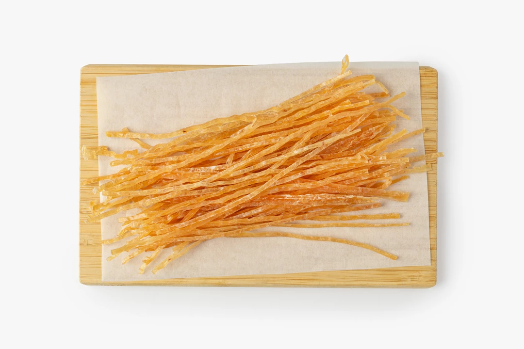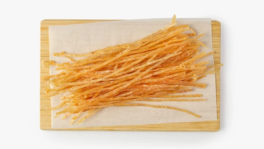 Паутинка из филе тихоокеанского кальмара. Мясо этого моллюска имеет приятный сладковатый вкус — и входящая в состав морская соль отлично его подчёркивает. К тому же кальмары, как и другие морепродукты, богаты белком, так что такой снек не только вкусный, но и полезный. Продукт продаётся на вес: привезём столько, сколько нужно.