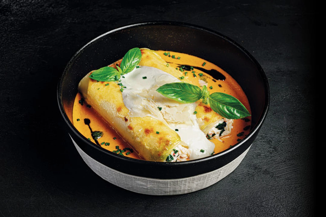 Каннеллони краб-креветки с соусом биск «Дары Камчатки»