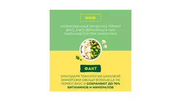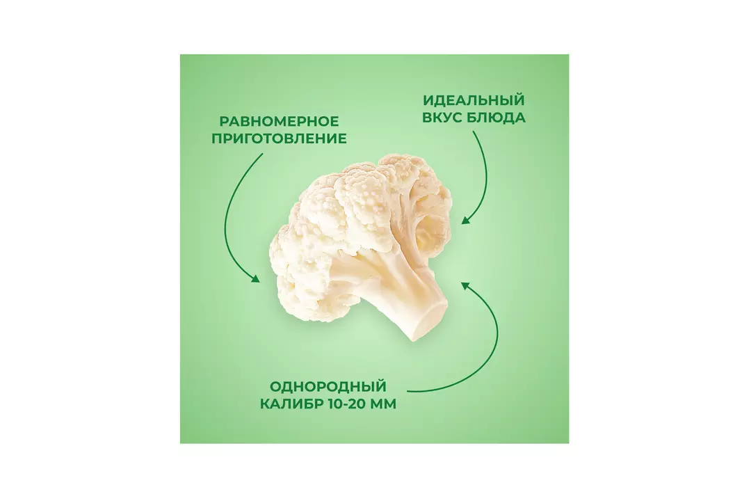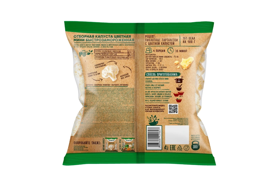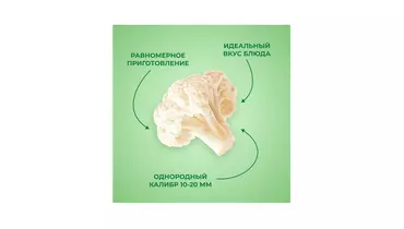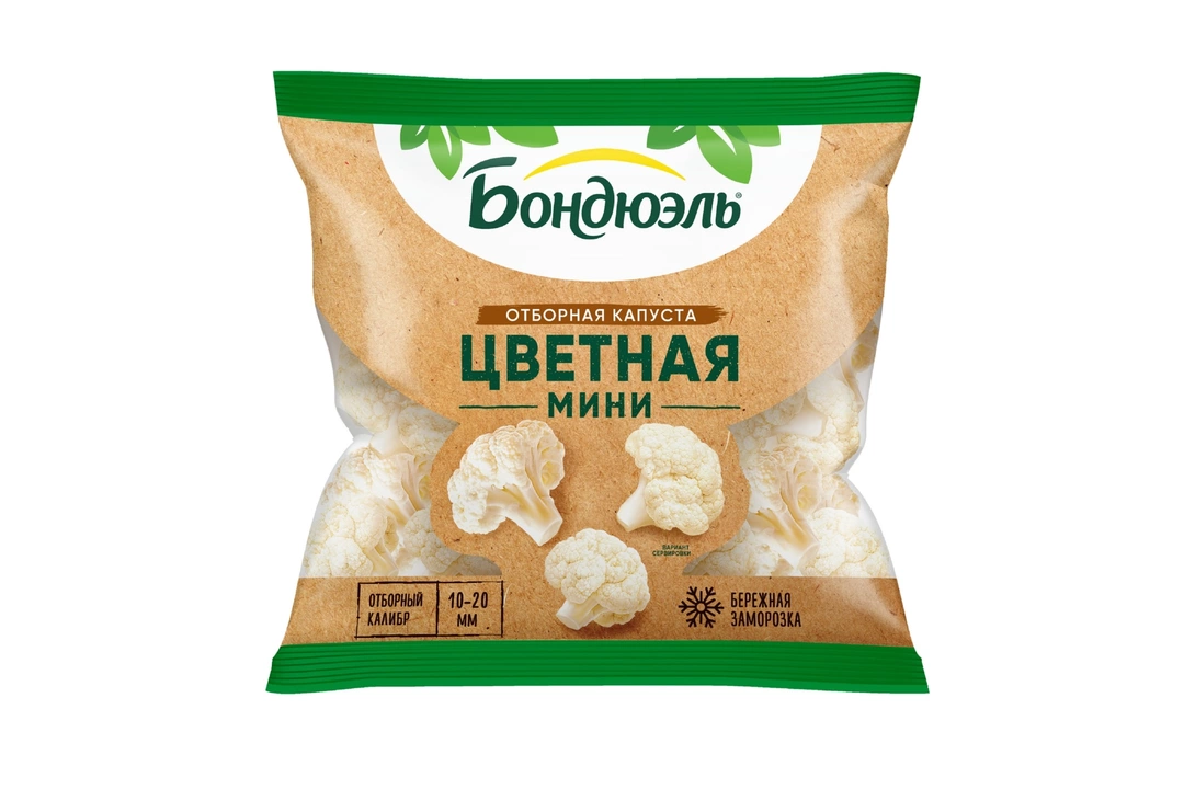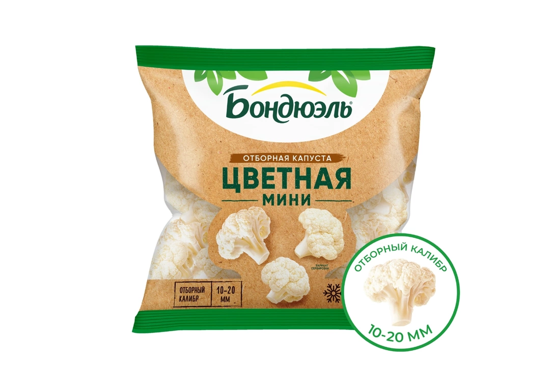 Мини цветная капуста Бондюэль выращена фермерами в экологически чистых районах Черноземья и собрана на пике зрелости, когда овощи содержат максимальное количество витаминов. После чистки и мойки современная технология шоковой заморозки позволяет сберечь максимум питательных веществ, а также сохранить максимум витаминов, нежный молочный цвет и хрусткую текстуру. Добавьте отборные и качественные соцветия небольшого калибра в салат, гарнир или выпечку, чтобы сделать свой рацион полезнее и сбалансированнее. Страна производитель-Россия