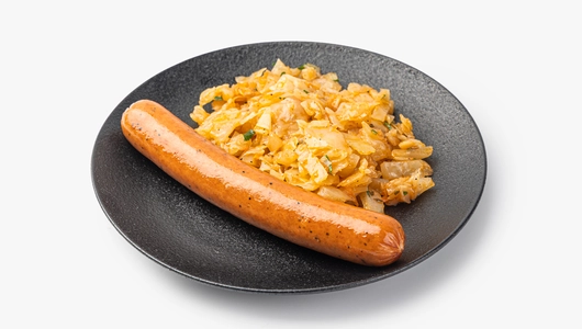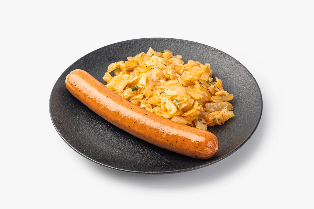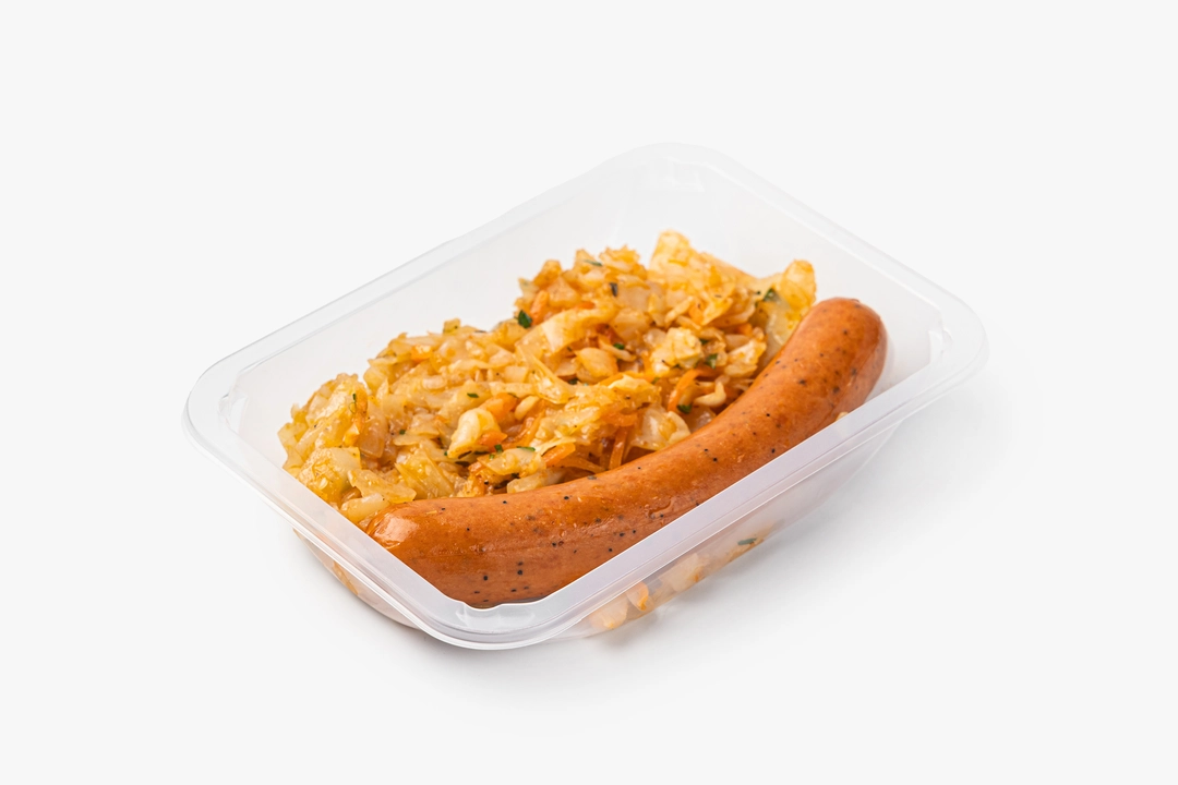 Тушёная капуста с куриной сосиской — это готовый обед или ужин по-домашнему. Мы приготовили капусту в томатном соусе с чесноком и тимьяном, отварили сочную сосиску с сыром и посыпали рубленой петрушкой, чтобы придать гарниру свежий оттенок. Блюдо приедет к вам горячим, его сразу можно выложить на тарелку и поставить на стол. Оно избавит вас от долгой готовки и позволит насладиться любимой едой, приготовленной с особенной заботой.