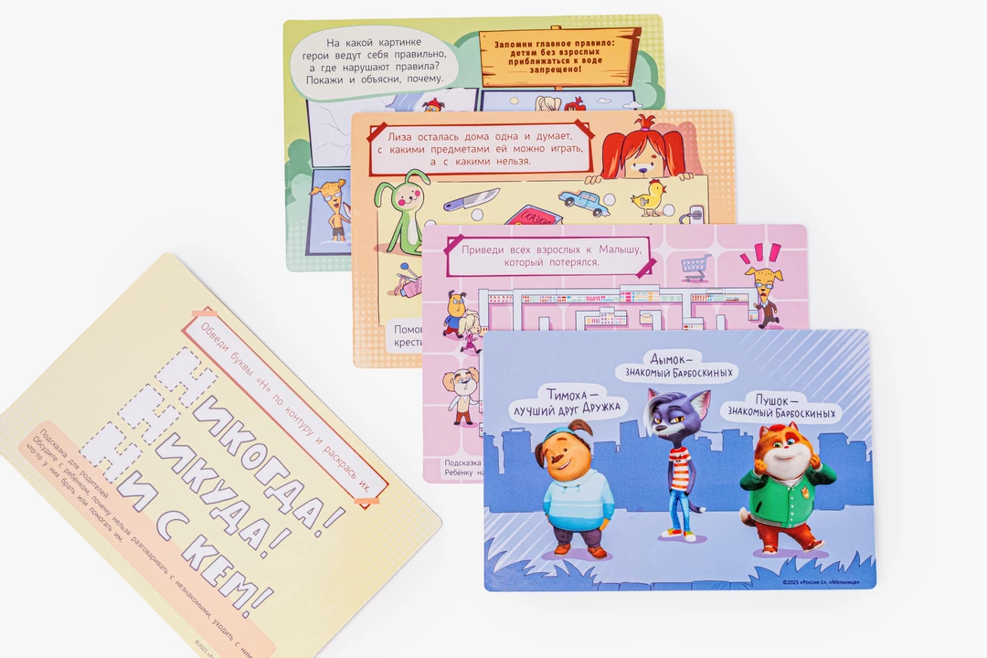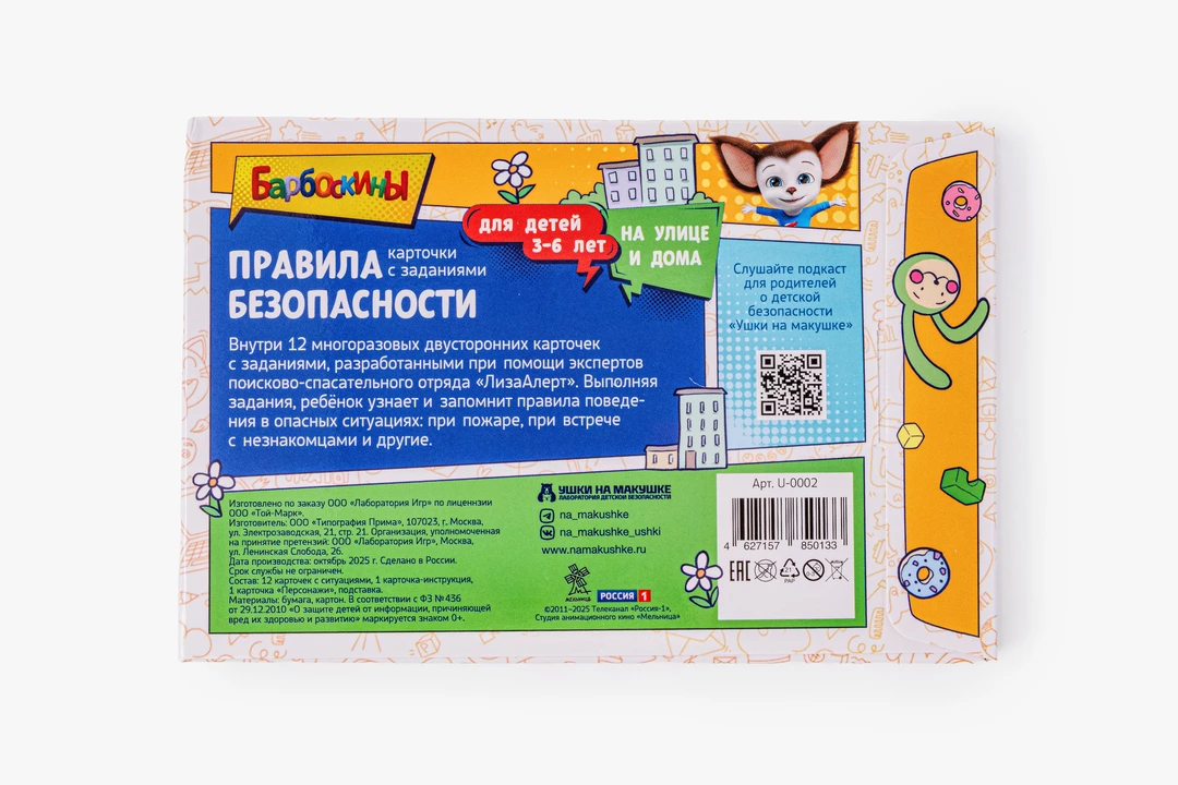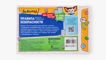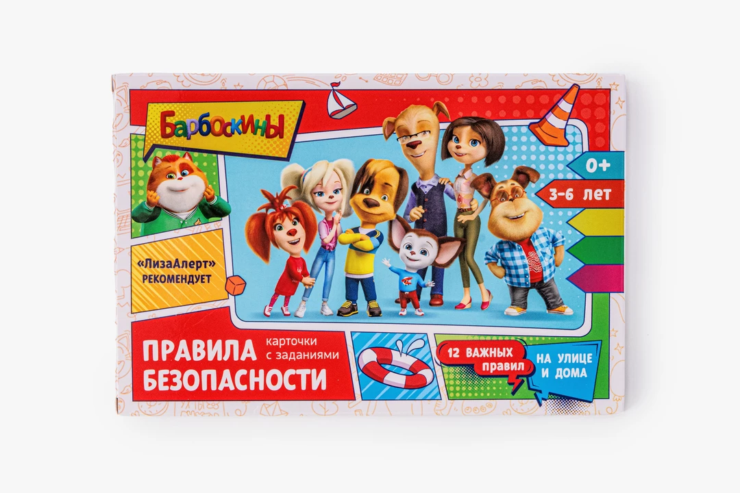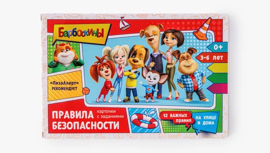 Набор карточек помогает в игровой форме познакомить детей с основными правилами безопасности дома и на улице. Внутри — 12 двусторонних карточек с понятными иллюстрациями и заданиями, которые помогают закрепить знания через игру, а также инструкция для родителей и картонная подставка для занятий. Карточки рассчитаны на детей от 3 до 6 лет и подходят для занятий дома, в детских садах, кружках и на уроках. Ребёнок шаг за шагом знакомится с важными правилами поведения в потенциально опасных ситуациях, учится распознавать риски и запоминать базовые алгоритмы действий. Специальная версия создана с персонажами мультсериала «Барбоскины», а задания разработаны Лабораторией детской безопасности «Ушки на макушке» при участии экспертов поисково-спасательного отряда «ЛизаАлерт», чтобы материал был одновременно понятным, полезным и увлекательным для самых маленьких.