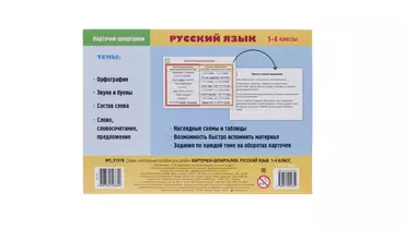 Предлагаем Вам карточки-шпаргалки по русскому языку. Эти простые и удобные в работе карточки помогут ребенку повторить все темы и правила русского языка, изучаемые в начальной школе. Благодаря наглядным схемам и примерам школьник быстро вспомнит пройденный на уроках материал. Задания и упражнения на обороте карточек сделают процесс запоминания и усвоения знаний легче и эффективней. В нашем наборе 32 карточки, выполненные из плотного картона. Размер карточки: 12*17 см. Им можно пользоваться не только для занятий дома, но и брать с собой в дорогу.