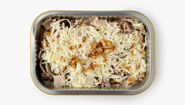 Картофель по-деревенски с шампиньонами и ветчиной — это идея для простого и сытного ужина. Мы уже нарезали картофель дольками и запекли с копчёной паприкой, обжарили грибы и приготовили густой соус. Нежная ветчина и ломтики бекона добавляют мясной акцент, а лук фри — пикантный оттенок. Вам нужно лишь подогреть всё в духовке или микроволновой печи, чтобы моцарелла расплавилась, а картофель немного подрумянился. Подавайте блюдо с лёгким овощным салатом или солёными огурчиками, чтобы ещё больше подчеркнуть домашнюю атмосферу. Ваши гости и близкие попросят добавки, а вы получите заслуженные комплименты своим кулинарным талантам.