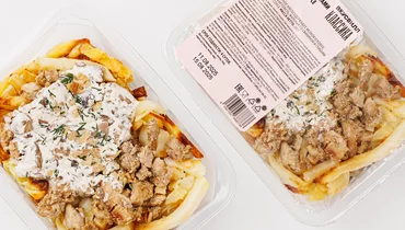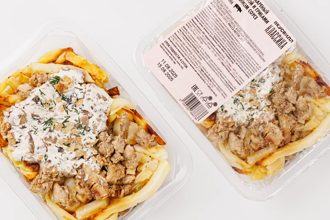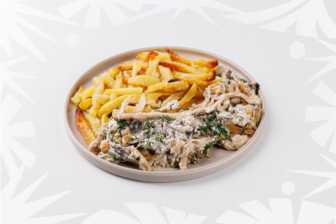Сытное блюдо из жареного картофеля и свиного окорока в сметанно-грибном соусе. Состав проверен: нет усилителей вкуса, консервантов и антибиотиков