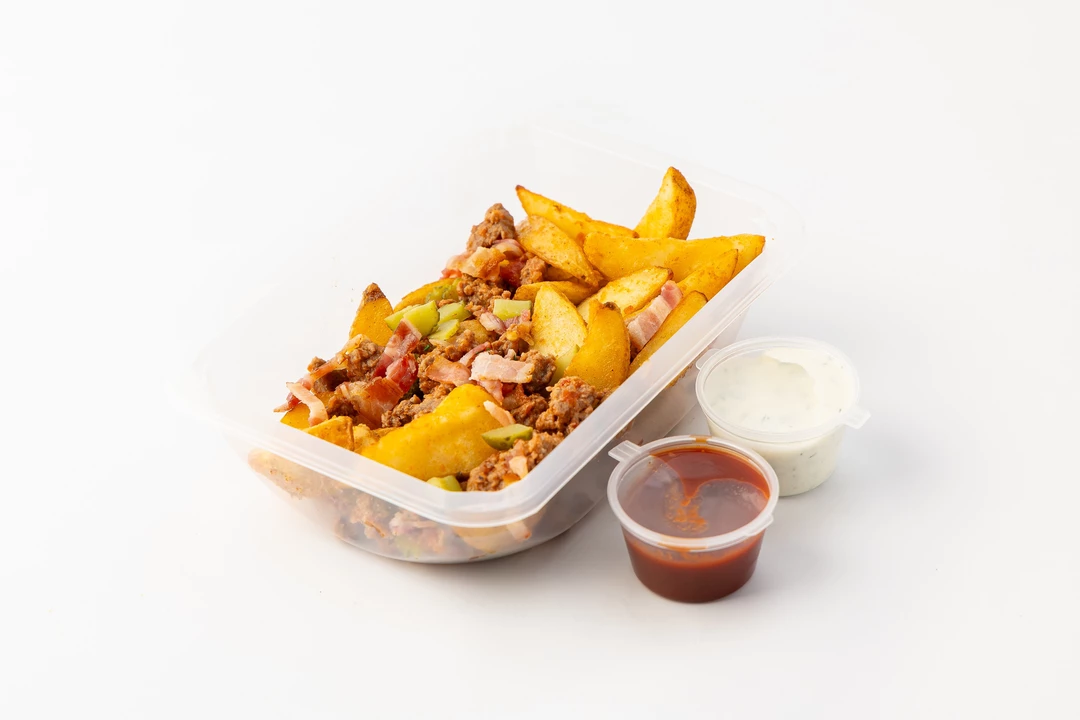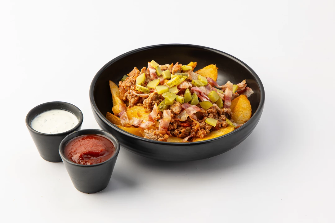 Картофельные дольки с мясным фаршем, беконом и маринованными огурцами, кафе