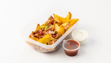 Хрустящие картофельные дольки в пряной панировке, говяжий фарш и копчёный бекон — это новое прочтение знакомого рецепта. Маринованные огурчики вносят деликатную кислинку, а красный лук — пикантный акцент. Сальса с халапеньо придаёт блюду лёгкую остроту, а чесночный соус — сливочные ноты. Этот вариант картофеля по-деревенски получается достаточно сытным, чтобы быть полноценным обедом. Блюдо доступно только для самовывоза из офлайн-точек Сгоряча и приедет к вам горячим и готовым к подаче. Его тоже можно выбрать Любимым продуктом и покупать с приятной скидкой.