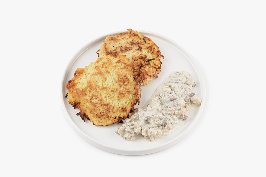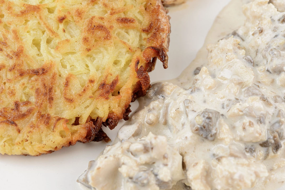 Классические картофельные драники с курицей и грибами — это готовый вариант обеда или ужина. Мы приготовили оладьи из тёртого картофеля, а в другой контейнер упаковали соус на основе сливок с кусочками куриного филе и шампиньонов. Перед подачей блюдо нужно слегка подогреть, чтобы драники подрумянились, а заправка стала ещё более ароматной. Вы можете полить драники соусом или подать его отдельно в соуснике.