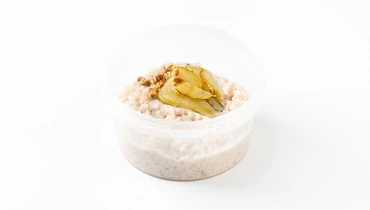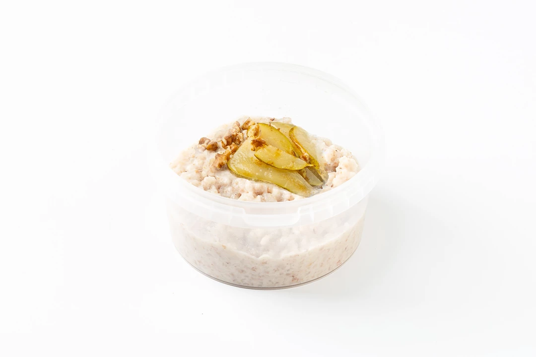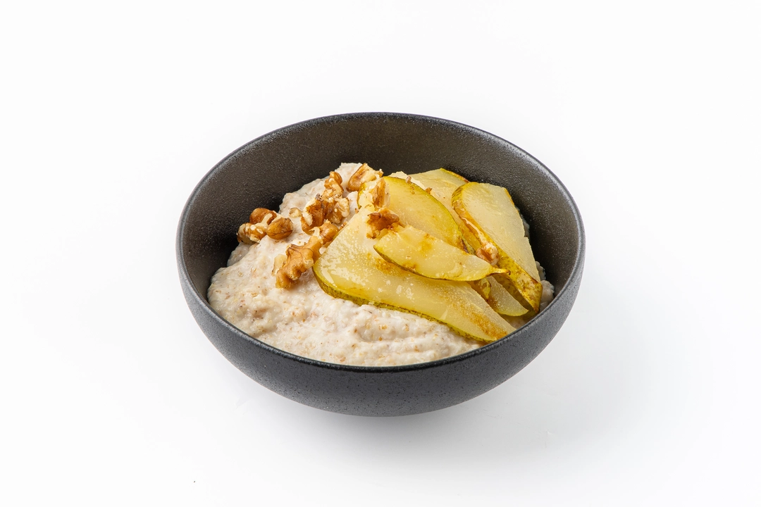 Сытная мультизлаковая каша на молоке с хлопьями овса, гречки, пшеницы, ржи и ячменя обладает глубоким зерновым вкусом и кремовой текстурой. Печёные дольки груши карамелизуются и становятся мягкими, добавляя сладость, а грецкие орехи вносят приятную хрусткость и лёгкую горьковатую ноту. Каша приедет горячей — её можно подавать сразу, чтобы оценить сочетание тёплой зерновой основы, нежной груши и орехового акцента.