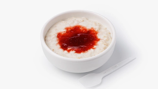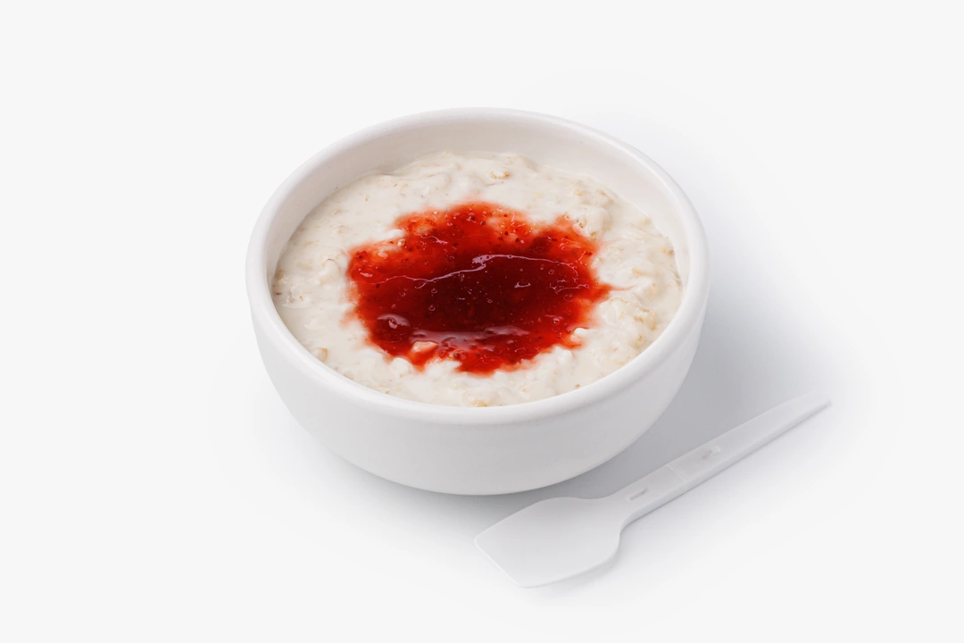 Нежная овсяная каша на молоке с мягкой, кремовой текстурой — спокойный и понятный завтрак. Хлопья хорошо разварены, сливочное масло делает вкус более тёплым и насыщенным. Клубничный топпинг можно добавить сразу, чтобы получить ягодную сладость с лёгкой кислинкой, или вмешивать понемногу, подстраивая вкус под настроение. Такой формат удобен, когда хочется простого, но не скучного начала дня — с ощущением домашнего завтрака, даже если ешь его вне дома.