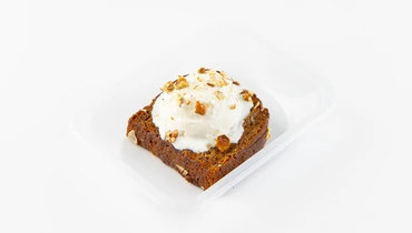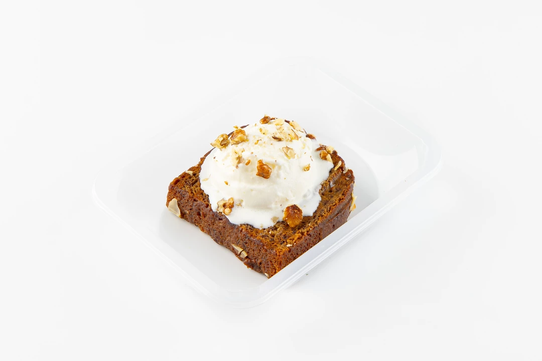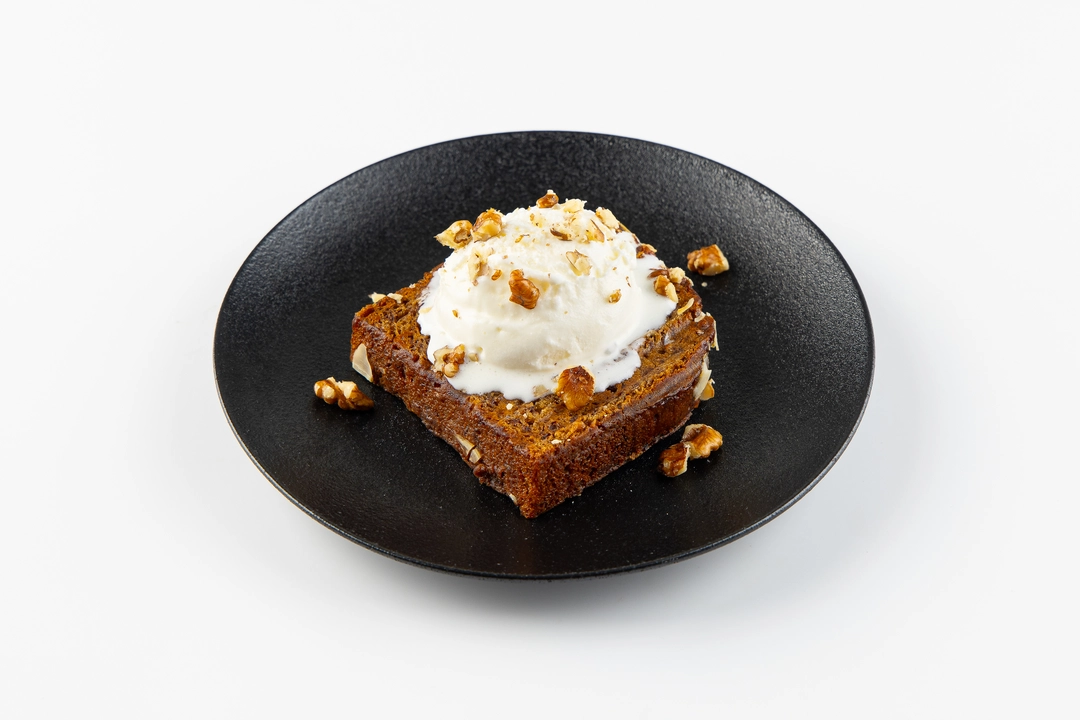 Ароматный морковный кекс с пряной ноткой корицы подаётся с шариком сливочного пломбира, который постепенно тает и смягчает текстуру выпечки. Кекс получается плотным, но сочным за счёт моркови, сметаны и изюма, а грецкие орехи добавляют хруст и чуть терпкий, древесно-ореховый вкус. Контраст кекса и мороженого делает десерт особенно выразительным и сбалансированным. Подойдёт для неспешного чаепития или как сытное сладкое завершение обеда. Доступен для самовывоза из магазинов с зоной кафе.