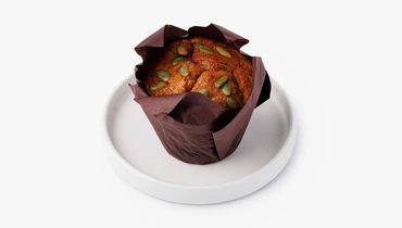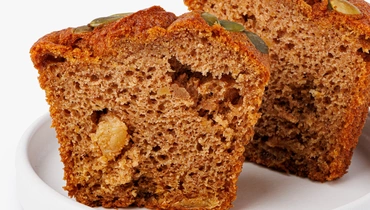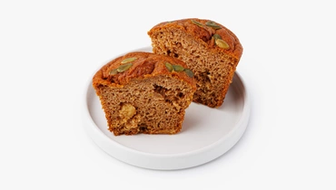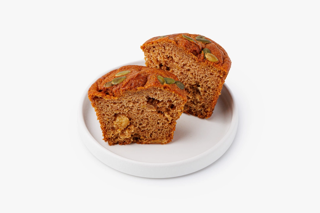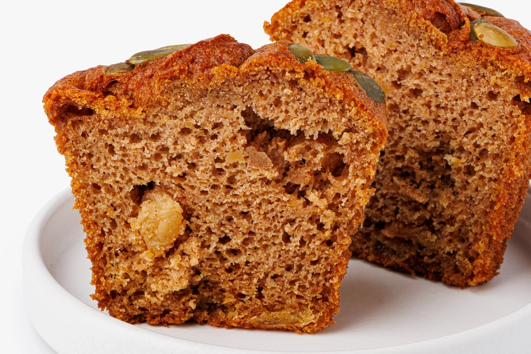 Кекс на основе тыквы с добавлением изюма, корицы, имбиря и мускатного ореха. Тесто плотное, умеренно сладкое, с мягкой влажной структурой.