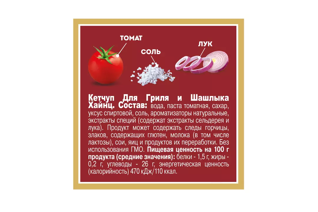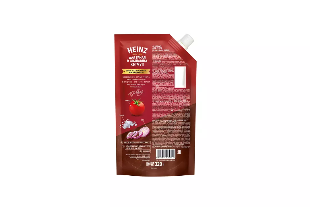 Томатный кетчуп Heinz для гриля и шашлыка идеально подойдет к мясу, приготовленному на гриле. Кетчупы Heinz производят из ароматной и густой томатной пасты, сохраняющей всю пользу и вкус спелых томатов особого сорта. Приправленная фирменными специями, паста превращается в невероятно вкусный томатный кетчуп благодаря опыту и огромной любви экспертов Heinz к своему делу. Heinz — все дело в томатах. - 100% натуральные ингредиенты; - Без крахмала; - Без искусственных ароматизаторов и красителей; - Без консервантов и ГМО. Томатный кетчуп Heinz для гриля и шашлыка незаменим на пикнике или домашнем барбекю как соус к мясу и птице. Шашлыки, бургеры, жаренные колбаски и куриные крылья отлично сочетаются с томатным кетчупом Heinz, раскрывая весь свой вкусовой потенциал. Кетчуп Heinz для гриля и шашлыка упакован в герметичные и удобные пакеты дой-пак весом 320 г. Такая упаковка надолго сохраняет свежесть продукта. Благодаря компактности пачек ваши любимые кетчупы Heinz удобно хранить дома и брать с собой. Страна производитель-Россия