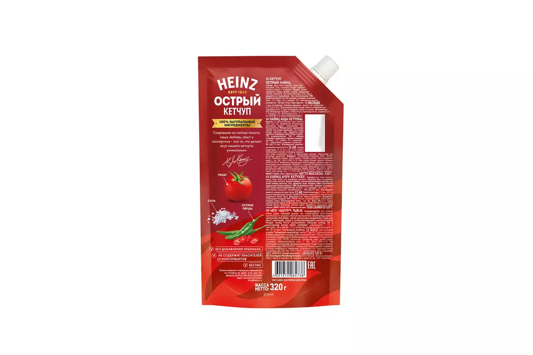Кетчуп Heinz острый дой-пак, 320г станет отличной приправой к самым разным блюдам. Известный бренд производит вкусные соусы по оригинальной рецептуре из натуральных продуктов. Такой кетчуп пригодится дома (в качестве добавки ко вторым блюдам, мясу, птице и т. д.), на пикнике или во время путешествия. Соус можно использовать в качестве отдельной добавке к готовым блюдам или же применять для того, чтобы придать им интересный пряный вкус во время приготовления (как альтернативу томатной пасте). Острый кетчуп оценят гурманы, которые любят добавлять его к деликатесам. Густой томатный соус удобно использовать: в него можно макать картофель фри, намазывать мясо или смешивать с другими соусами, например, с майонезом. Уже 150 лет Heinz неизменно радует потребителей высоким качеством и восхитительным вкусом своих продуктов. Страна производитель-Россия