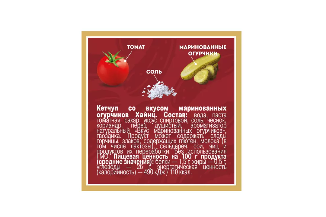 Томатный кетчуп Heinz со вкусом маринованных огурчиков - это оригинальный соус, который придаст привычным блюдам свежий и пикантный оттенок. Кетчуп Heinz обладает насыщенным ароматом и сочетает в себе классический вкус спелых томатов и пикантных нот маринованных огурчиков. Добавьте яркий и освежающий акцент с кетчупом Heinz со вкусом маринованных огурчиков. - 100% натуральные ингредиенты; - Не содержит красителей и консервантов; - Без ГМО; - Без добавления крахмала. Кетчуп Heinz со вкусом маринованных огурчиков незаменим на пикнике или домашнем барбекю как соус к мясу и птице. Шашлыки, бургеры и сэндвичи, жаренные колбаски и куриные крылья, закуски из овощей и множество других блюд отлично сочетаются с томатным кетчупом Heinz, раскрывая весь свой вкусовой потенциал. Томатный кетчуп Heinz упакован в герметичные и удобные пакеты дой-пак весом 320 г. Такая упаковка надолго сохраняет свежесть продукта. Благодаря компактности пачек ваши любимые кетчупы Heinz удобно хранить дома и брать с собой. Страна-производитель Россия