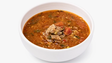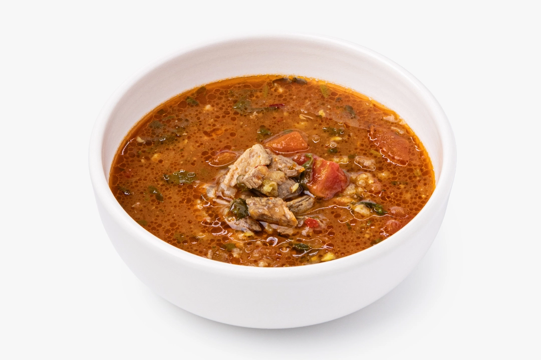 Насыщенный густой суп, где каждая ложка передаёт тепло кавказского гостеприимства. Говяжий бульон на чёрном перце и лавровом листе становится основой для нежного риса и сочных кусочков мяса. Пассерованный лук и томатная паста добавляют глубину, а хмели-сунели, уцхо-сунели и кинза создают тот самый узнаваемый пряный букет. Чеснок и красный перец придают лёгкую остринку. Прогрейте суп перед подачей, чтобы специи раскрылись, а рис пропитался ароматом бульона. Хорошо сочетается с грузинским лавашом — это блюдо согреет и напомнит о щедрых застольях, где еда становится праздником сама по себе.