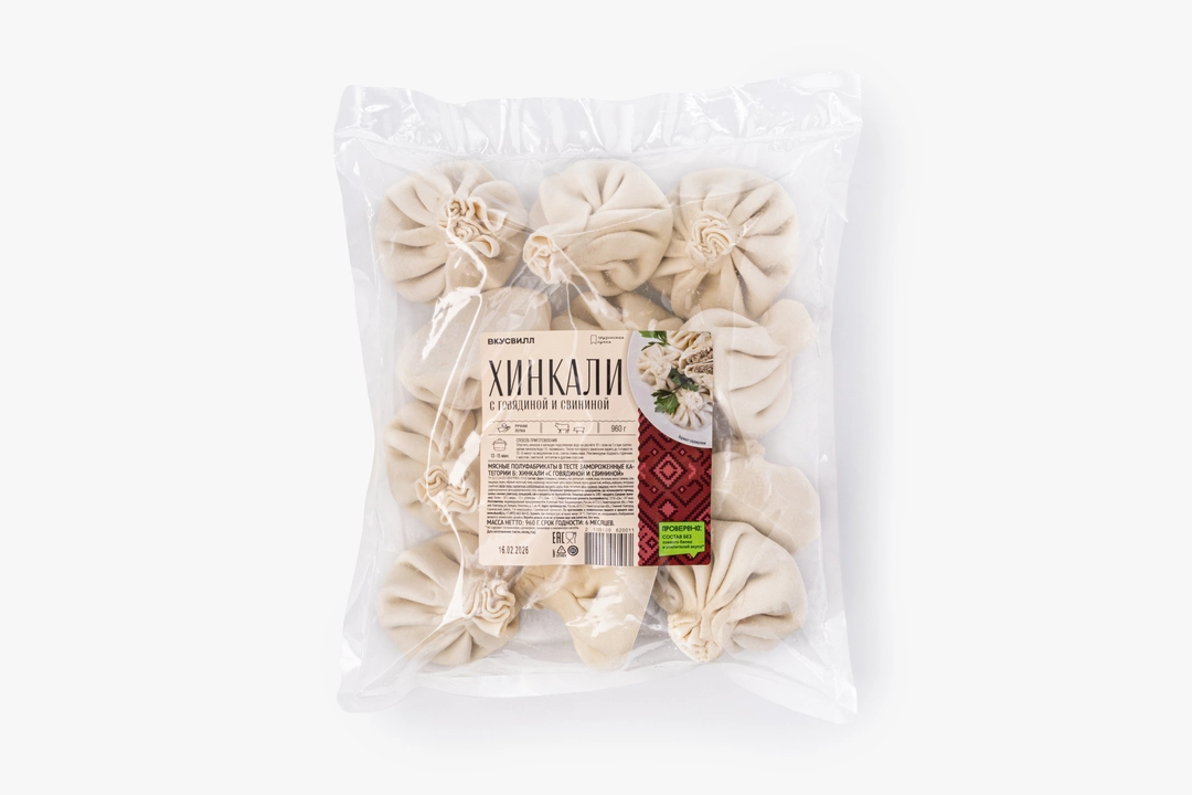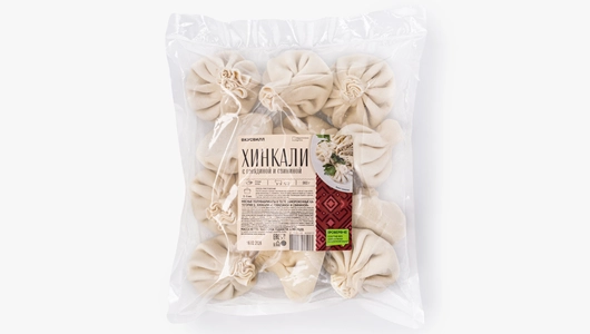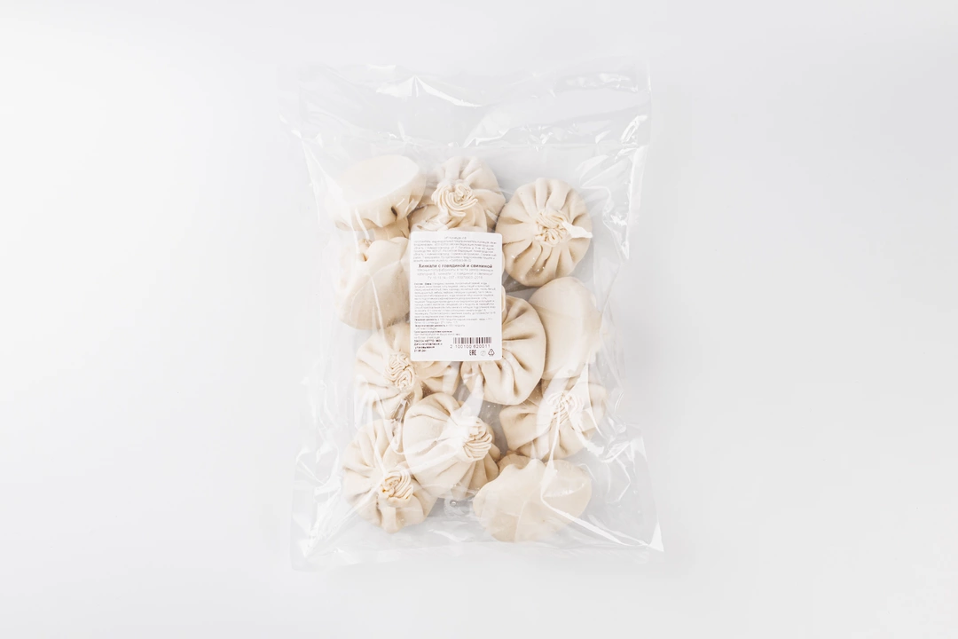 Большая порция сытных хинкали, приготовленных по традиционному грузинскому рецепту без соевого белка и ароматизаторов. Тесто у них тонкое, нежное, но при этом не разваривается и не слипается. Внутри много начинки из говядины и свинины с луком, кинзой, пряностями и ароматным бульоном.