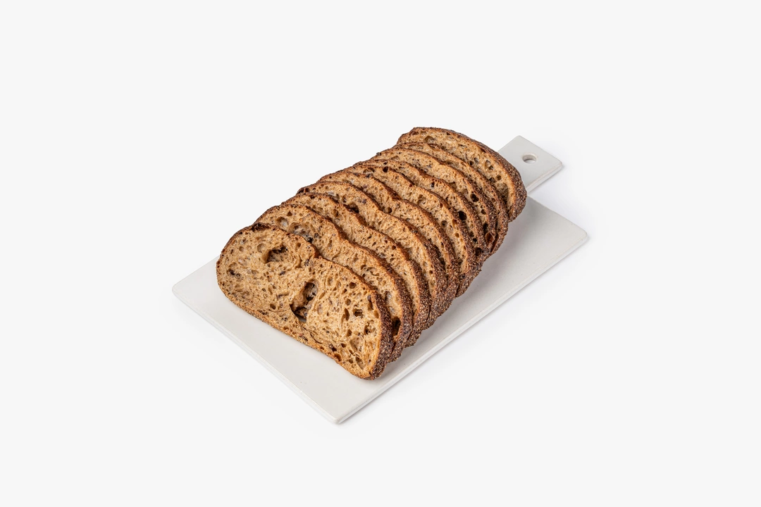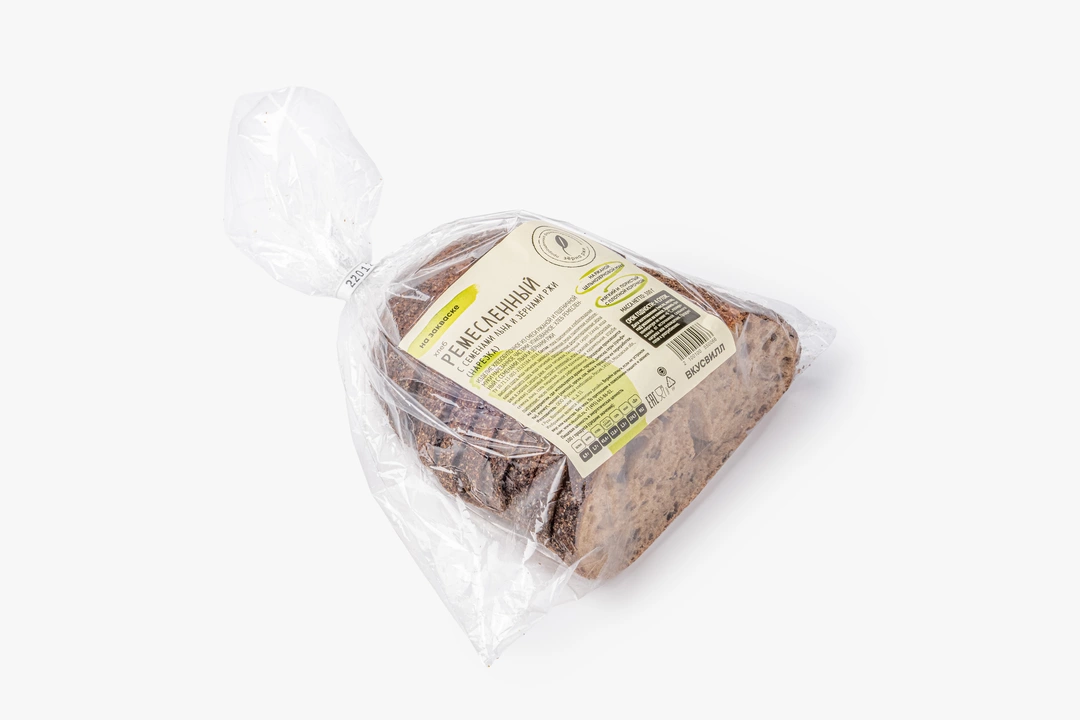 Ароматный ржано-пшеничный хлеб ручной работы, нарезанный аккуратными ломтиками. Приготовлен на пшеничной закваске без дрожжей. Мягкий, пористый, с плотной корочкой, дополненный льняными семечками и зёрнами ржи, он порадует своим вкусом и станет отличной основой для бутербродов.