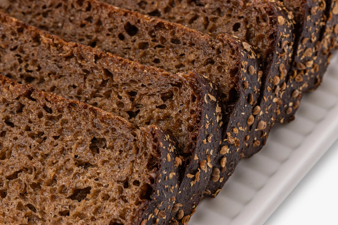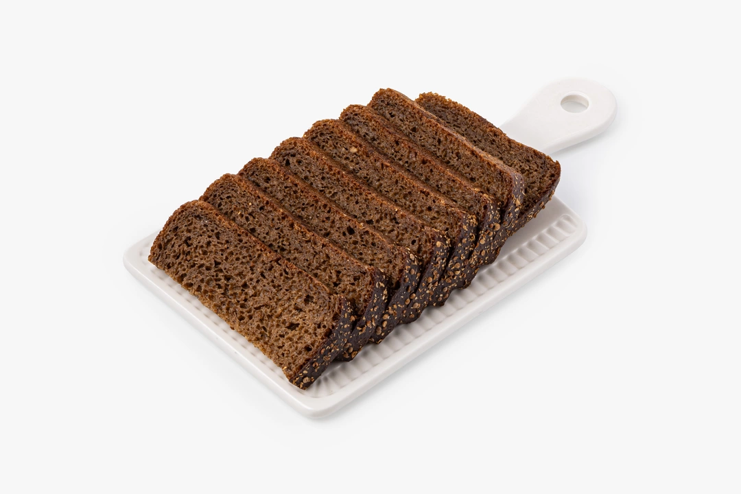 Хлеб в нарезке выпекаем на ржаной заварке с добавлением двух видов солода — ферментированного и неферментированного. Заварка придаёт мякишу плотную текстуру и насыщенный аромат с оттенками кориандра и солода. Подходит к мясным блюдам, супам или для бутербродов с сельдью.
