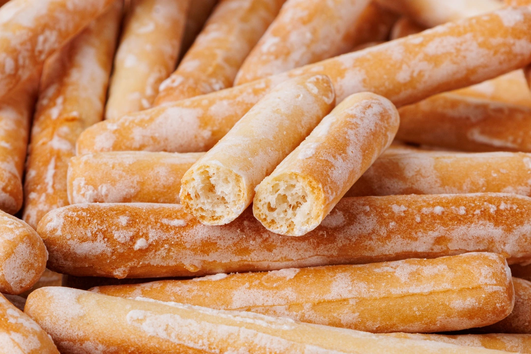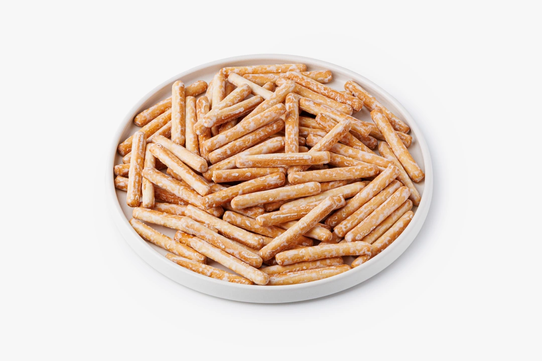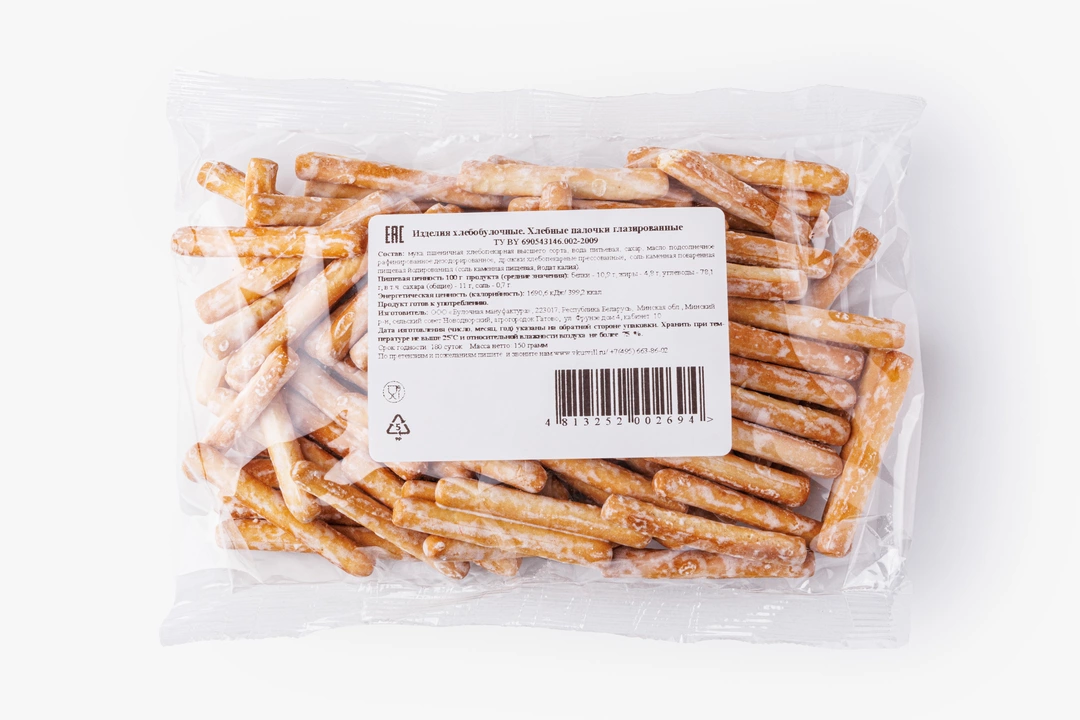 Хрустящие хлебные палочки с тонкой сладкой глазурью и ровной, плотной структурой. Тесто получается лёгким, а подсушенная корочка даёт приятный хруст. Небольшой слой глазури добавляет мягкую сладость, но не утяжеляет вкус. Палочки удобно брать с собой или подавать к чаю — они долго остаются хрустящими и не крошатся в упаковке.