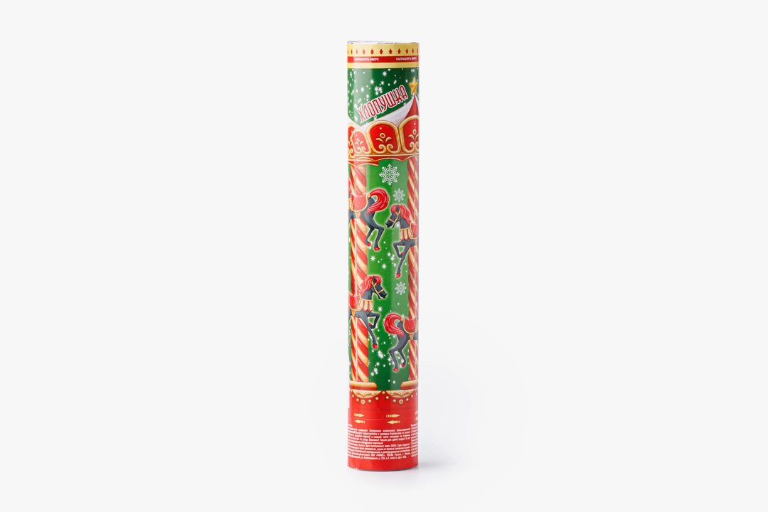 Хлопушка с фольгированным конфетти для создания праздничного настроения. Чтобы привести её в действие, нужно повернуть верхнюю и нижнюю часть по стрелкам, тогда сжатый воздух выбросит облако сверкающих блёсток. Конструкция с пневматическим механизмом позволяет безопасно запускать хлопушку в больших помещениях и на улице. Для детей от 14 лет под присмотром взрослых.