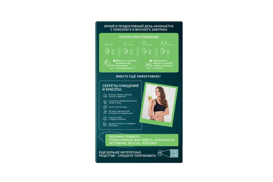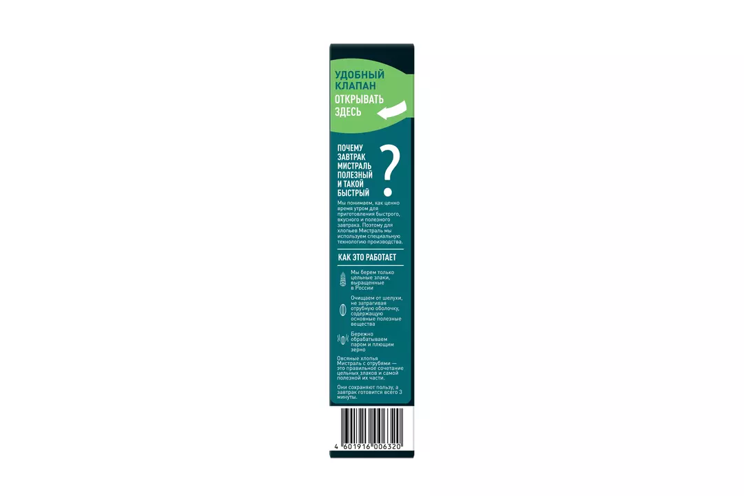 Секрет натуральности хлопьев Мистраль прост: наши хлопья — это то же зерно, только плоское. Мы закупаем злаки в оптимальных для них климатических зонах России, очищаем от шелухи, не затрагивая отрубевую оболочку, пропариваем под давлением, мелко рубим и расплющиваем. Смешиваем с отрубями — натуральным источником витаминов и клетчатки. Теперь можно приготовить полезный горячий завтрак, потратив лишь несколько минут. Страна-производитель Россия