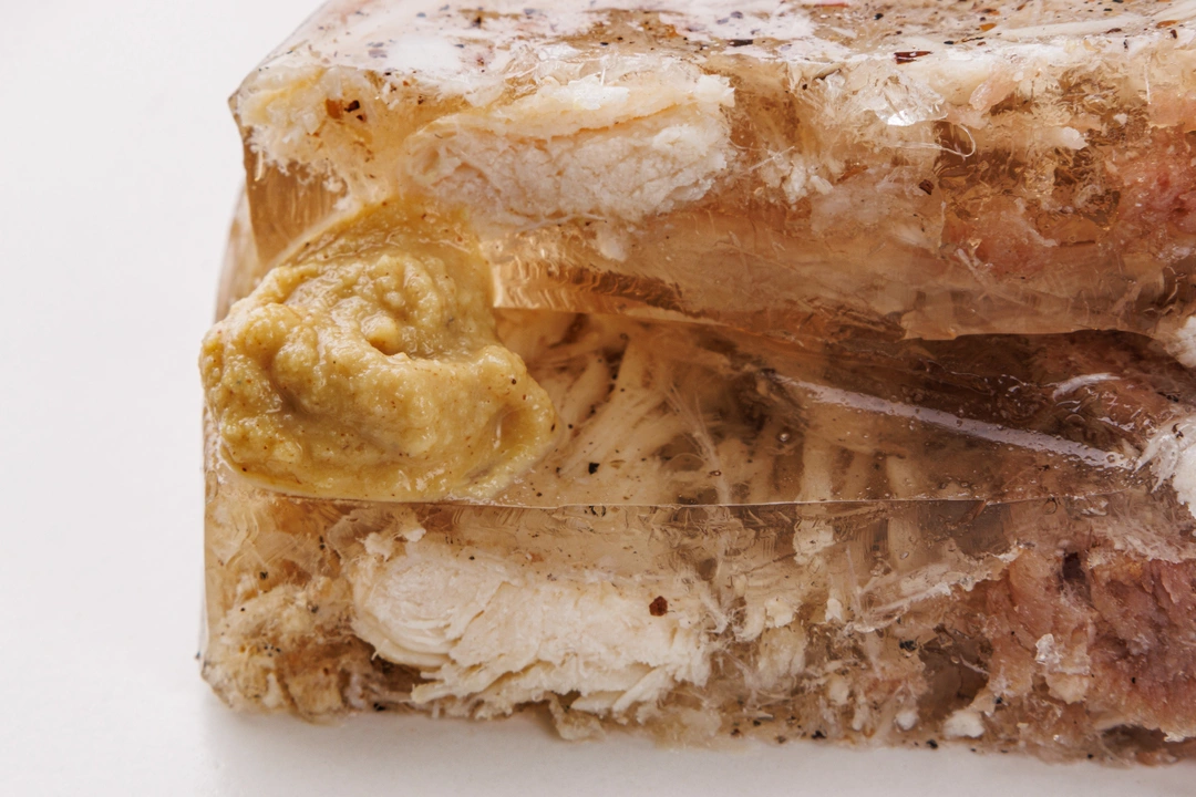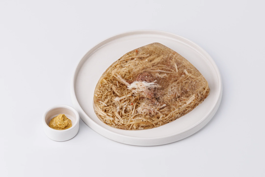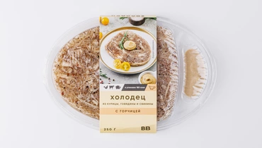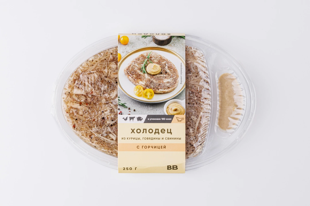Нежные кусочки курицы, говядины и свинины в прозрачном, плотном бульоне образуют классический холодец с насыщенным вкусом. Специи добавляют лёгкую пряность, а чеснок дополняет мясной аромат. В комплекте есть горчичный соус, который делает подачу ещё интереснее: его острота хорошо контрастирует с мягкой текстурой заливного. Такой холодец подают охлаждённым как самостоятельное блюдо или в составе закусочной тарелки.