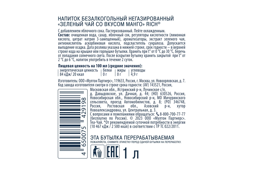 Холодный зеленый чай Rich Манго 1 л / Супермаркет