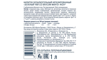 Rich Tea- это вкусные и натуральные напитки c мягким, приятным вкусом чая и фруктов , которые подарят наслаждение, освежат и утолят жажду. Попробуйте изысканный вкус свежего зелёного чая и сладкого экзотического манго Страна-производитель Россия