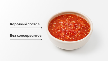Пикантная закуска из томатов, чеснока, хрена и черного молотого перца. Для приготовления используется только отечественное сырье.