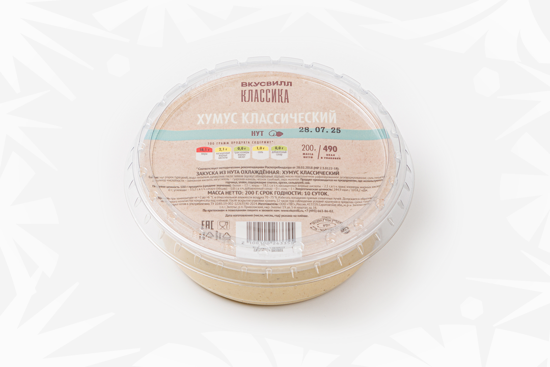 Хумус по традиционному рецепту в удобной баночке с крышкой. Состав проверен: нет усилителей вкуса, консервантов и антибиотиков