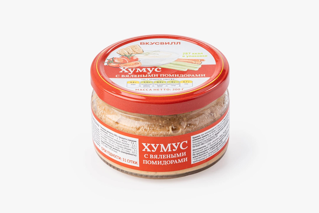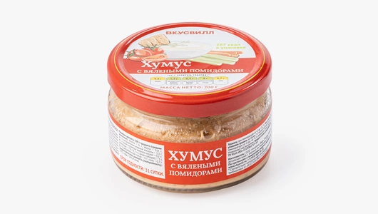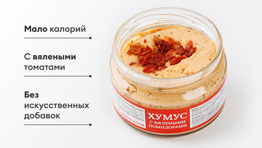 Мы приготовили хумус по традиционному рецепту и добавили в него вяленые томаты. Состав проверен: нет усилителей вкуса, консервантов и антибиотиков