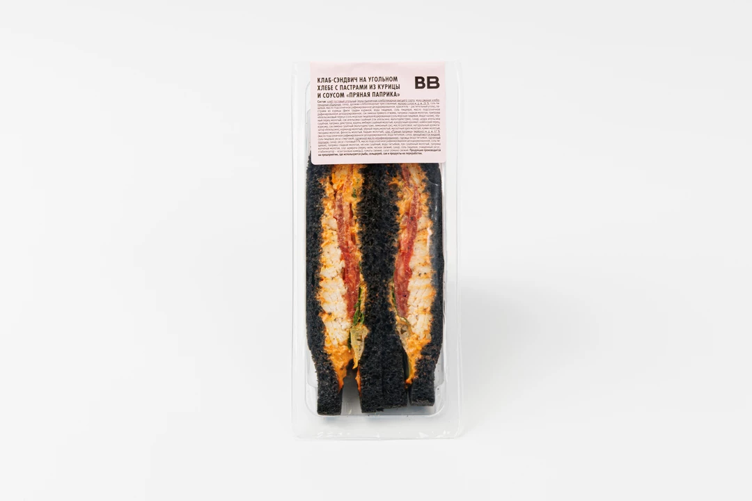 Клаб-сэндвич на угольном хлебе с пастрами из курицы и соусом "Пряная паприка"