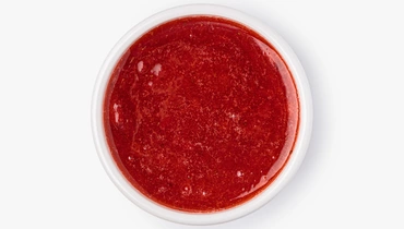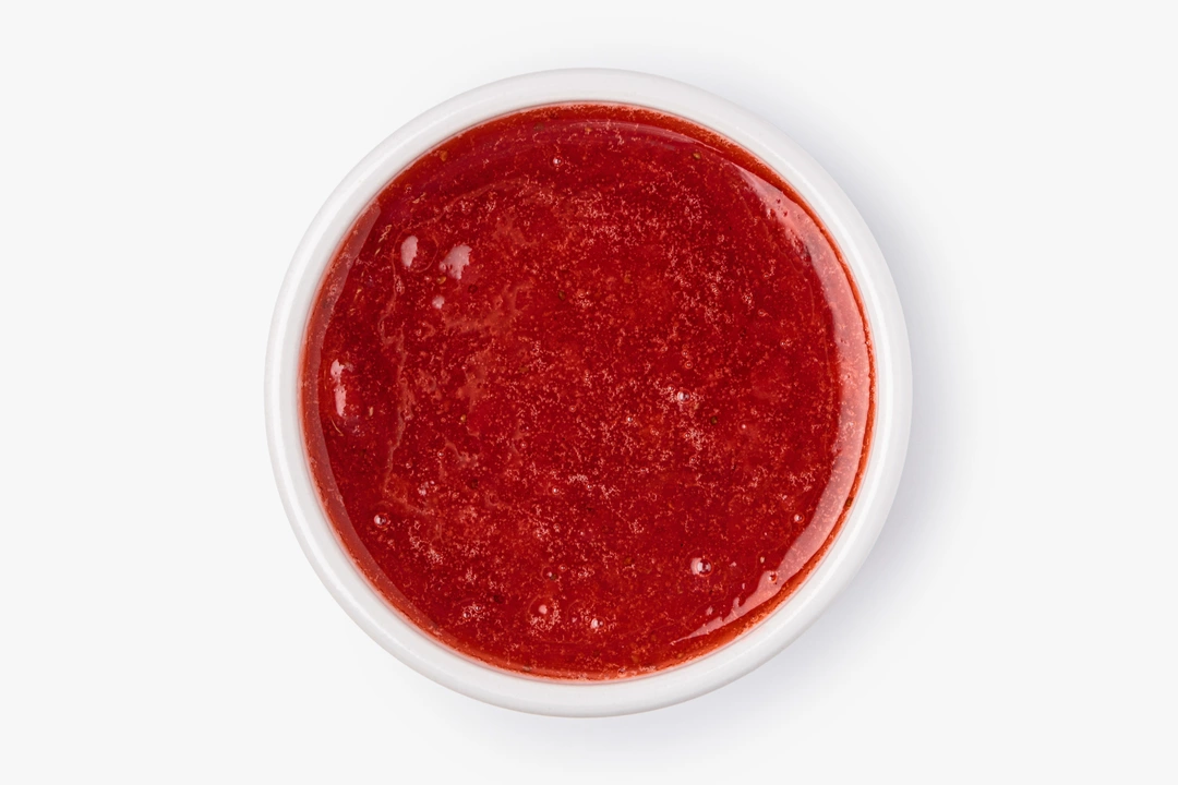 Клубника перетёрта с сахаром до состояния нежного пюре с мелкими ягодными кусочками. Удобно подавать к сырникам, блинчикам, творогу или добавлять в йогурты и каши. Перед использованием лучше перемешать — возможно естественное расслоение
