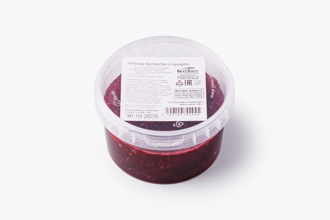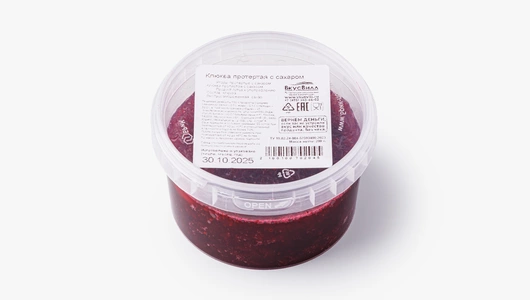 Сочная и спелая лесная клюква протёртая с сахаром. Этот «живой», без термической обработки, джем сохранил весь аромат и пикантный вкус ягод. Полезное, умеренно сладкое лакомство к чаю или молоку. Из такого ягодного пюре можно сделать начинку для выпечки, добавить его к блинчикам, в кашу, мороженое или смузи.