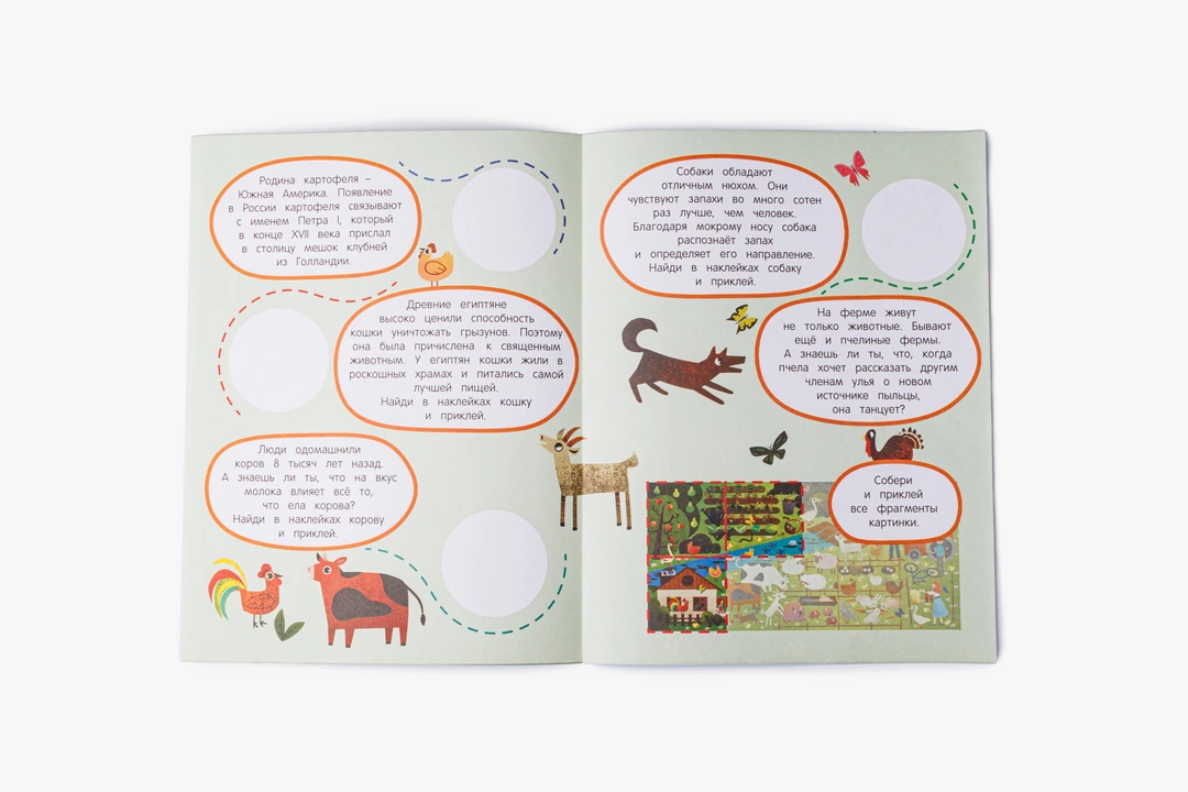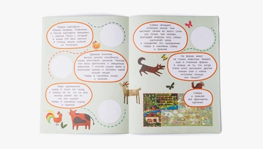 Книжка-гармошка разворачивается в длинное двустороннее игровое поле с яркими иллюстрациями из жизни фермы. Малыш может выполнять задания, приклеивая картинки и рассказывая о том, что он видит. В игре ребёнок запоминает названия животных, учится их считать и находить спрятанные предметы. Работа с мелкими элементами тренирует пальчики, развивает аккуратность и координацию движений. Книжка помогает расширить словарный запас.