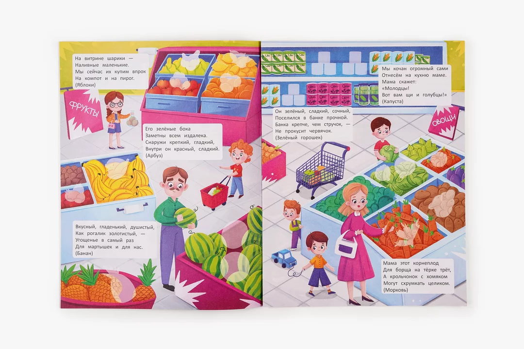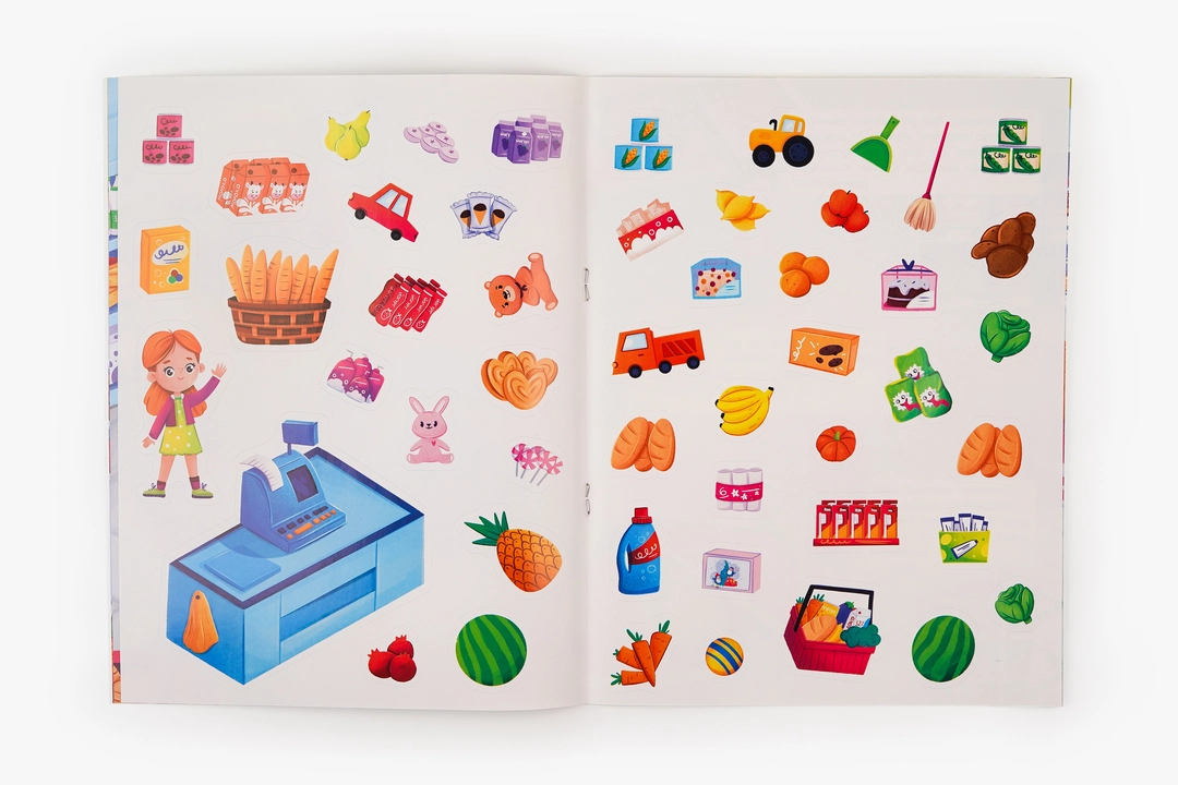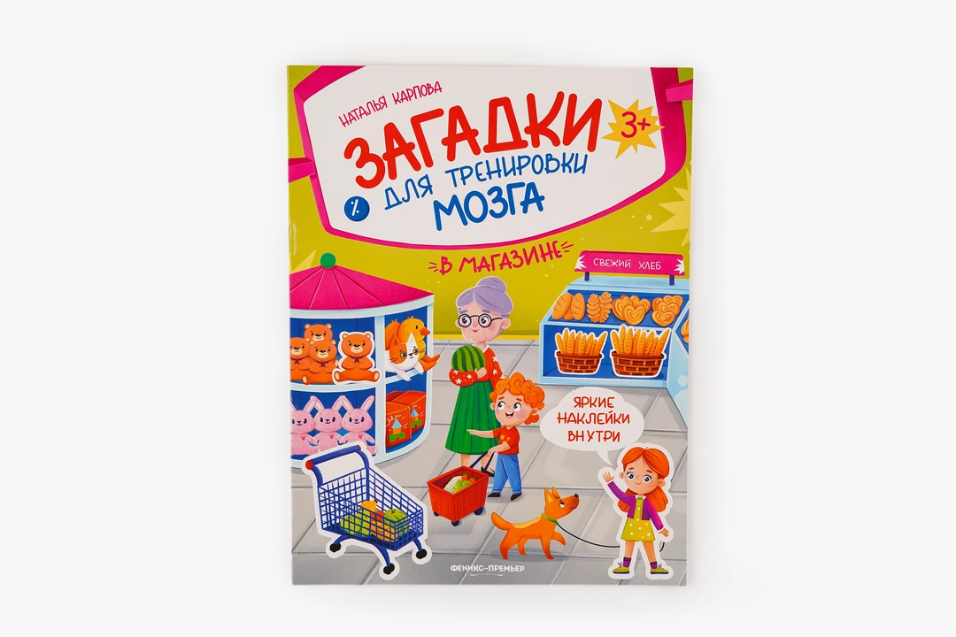 Эта книга с наклейками поможет малышу познакомиться с тем, что происходит в магазине. На страницах собраны загадки от детской писательницы Натальи Карповой — ребёнку предстоит отгадывать ответы и дополнять картинки красочными наклейками. Такое занятие развивает логику, расширяет словарный запас и тренирует мелкую моторику. Яркие иллюстрации и понятные сюжеты удерживают внимание, а совместное разгадывание с родителями делает процесс ещё увлекательнее. Книга подходит для детей любого возраста.