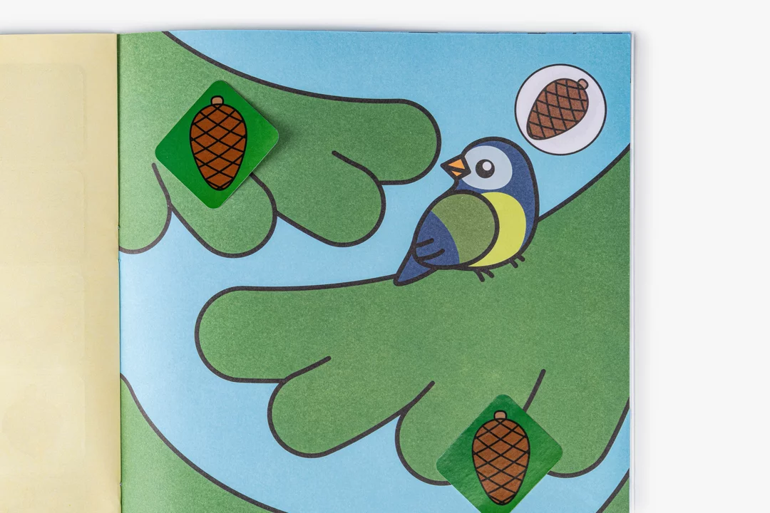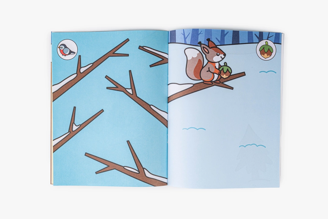 Книжка с наклейками знакомит малыша с зимними лесными пейзажами, на каждом развороте — новые сценки из жизни обитателей леса. Контрастные иллюстрации помогают удерживать внимание, а крупные яркие стикеры удобно брать маленькими пальчиками и приклеивать на страницы. Ребёнок сможет самостоятельно рассыпать снежинки над ёлочкой, добавить следы на снегу и развесить ягоды рябины по веткам. Работа с наклейками развивает координацию движений и мелкую моторику.