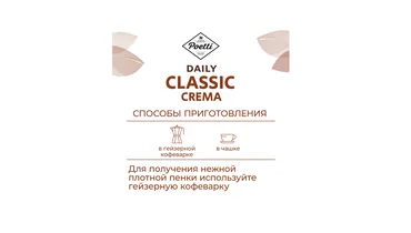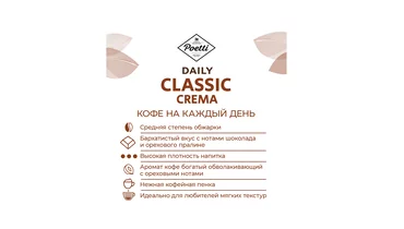 Poetti Daily — это линейка натурального кофе высокого качества на каждый день. Эксперты с многолетним опытом в обжарке кофе и профессиональные бариста разработали бленды, чтобы кофе радовал Вас вкусом и заряжал энергией! Poetti Daily - бодрящий кофе для продуктивного дня. Сочетание отборной арабики и премиальной робусты создает бархатистый вкус Daily Classic Crema. Кофе с нотами шоколада и орехового пралине с богатым ореховым ароматом. Напиток высокой плотности с нежной кофейной пенкой порадует любителей мягких текстур. Средняя степень обжарки. Идеален для приготовления в чашке, френч-прессе, автоматической кофемашине и гейзерной кофеварке. Poetti Daily Classic Crema — это бархатистый вкус и мягкая текстура в каждой чашке! Страна производства - Россия.