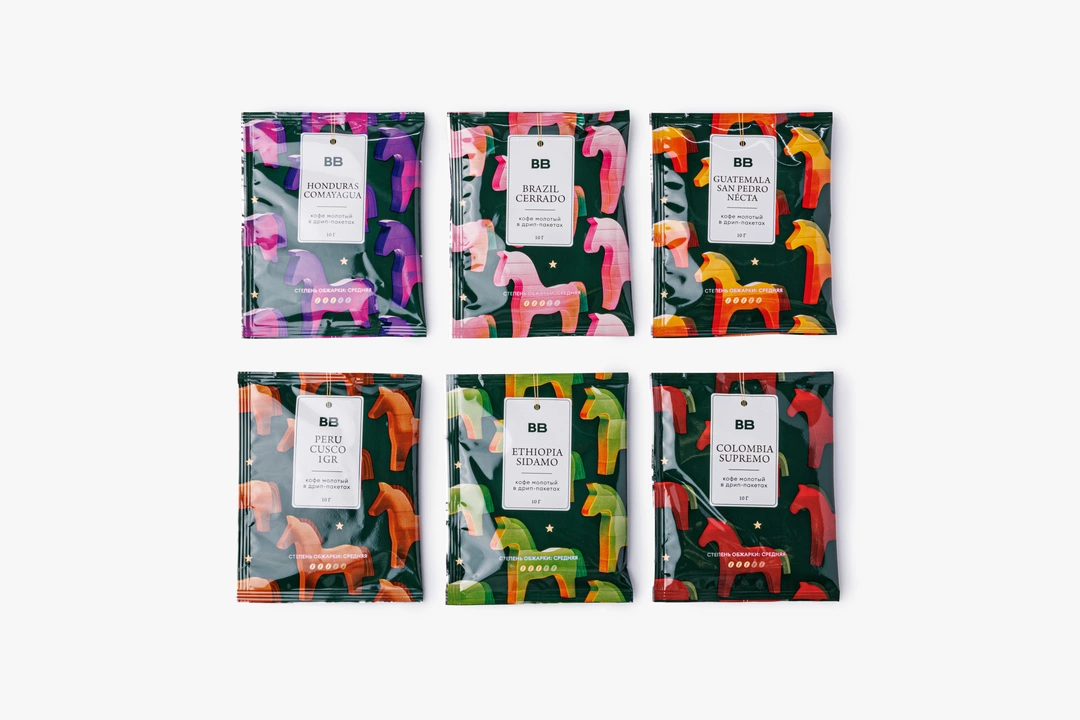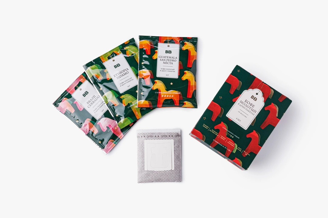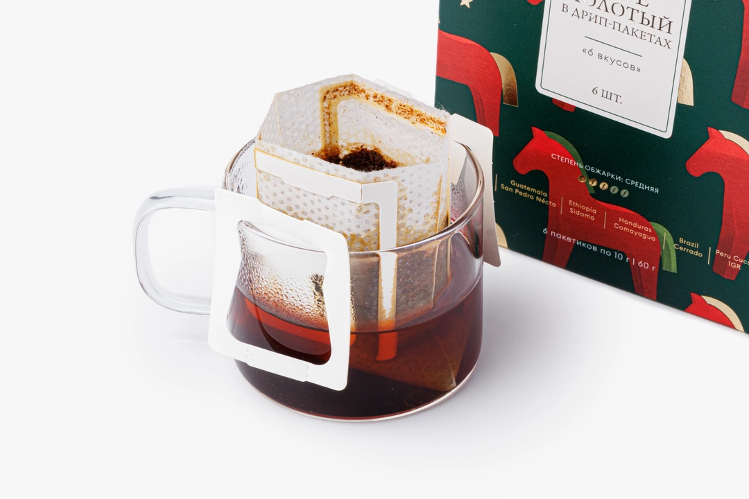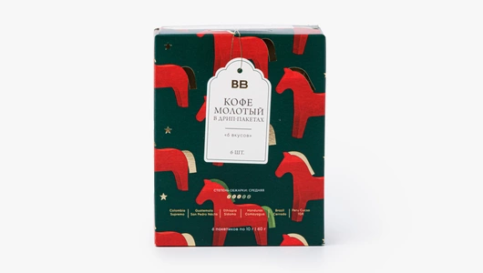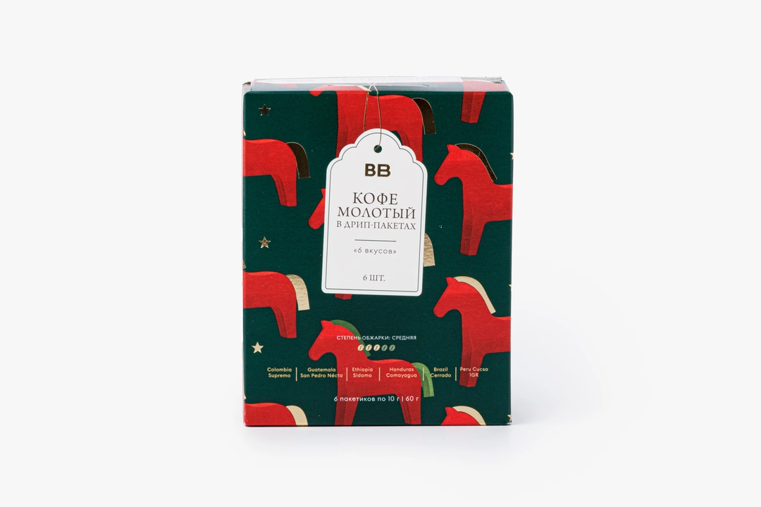 Ассорти арабики в кофе-дрипах из лимитированной серии — в упаковке с волшебным дизайном. Коробочка прекрасно дополнит домашнюю новогоднюю атмосферу и подойдёт для подарка истинным кофеманам. Внутри — 6 дрип-пакетов, которые отправят вас в путешествие по кофейным регионам Латинской Америки и Африки. В маршруте 6 стран: Колумбия, Гватемала, Гондурас, Бразилия, Перу и Эфиопия. Каждый экземпляр обладает собственным уникальным вкусом и ароматом. А качество напитка не уступит фильтру из любимой кофейни.