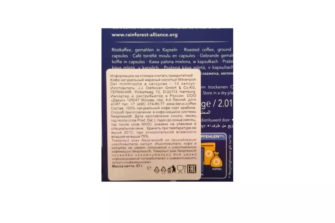 Кофе в капсулах Movenpick Der Himmlische — кофе, ставший классикой. В его основе — отборные зёрна из лучших кофейных регионов мира, которые дарят напитку насыщенный и удивительно сбалансированный вкус. Название «Der Himmlische» переводится с немецкого как «небесный» — это дань уважения первому фирменному лакомству Movenpick, созданному ещё в 1963 году. Этот кофе продолжает традицию безупречного вкуса, принося настоящее наслаждение. Состав: 100% натуральный кофе сорт арабика. Способ приготовления: в кофе-машине системы Nespresso®. Интенсивность: 5/10, Обжарка: средняя. Страна изготовитель: Германия