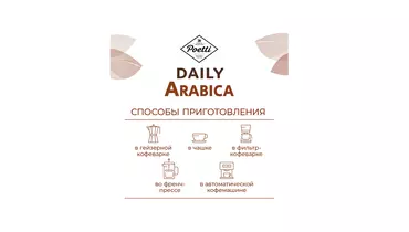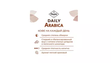 Poetti Daily — это линейка натурального кофе высокого качества на каждый день. Эксперты с многолетним опытом в обжарке кофе и профессиональные бариста разработали бленды, чтобы кофе радовал Вас вкусом и заряжал энергией!Poetti Daily - бодрящий кофе для продуктивного дня.Daily Arabica — это 100% отборная арабика средней степени обжарки со сладким сбалансированным вкусом и ореховым ароматом. Напиток средней плотности раскрывается нотами спелых цитрусов и молочного шоколада.Poetti Daily Arabica — всегда вкусный кофе в каждой чашке! Страна производитель-Россияv