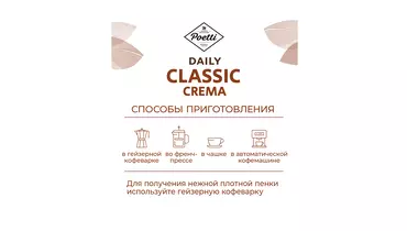 Poetti Daily — это линейка натурального кофе высокого качества на каждый день. Эксперты с многолетним опытом в обжарке кофе и профессиональные бариста разработали бленды, чтобы кофе радовал Вас вкусом и заряжал энергией! Poetti Daily - бодрящий кофе для продуктивного дня. Сочетание отборной арабики и премиальной робусты создает бархатистый вкус Daily Classic Crema. Кофе с нотами шоколада и орехового пралине с богатым ореховым ароматом. Напиток высокой плотности с нежной кофейной пенкой порадует любителей мягких текстур. Средняя степень обжарки. Poetti Daily Classic Crema — это бархатистый вкус и мягкая текстура в каждой чашке!