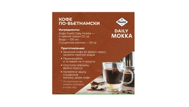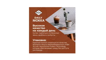 Poetti Daily — это линейка натурального кофе высокого качества на каждый день. Эксперты с многолетним опытом в обжарке кофе и профессиональные бариста разработали бленды, чтобы кофе радовал Вас вкусом и заряжал энергией! Poetti Daily - бодрящий кофе для продуктивного дня. Бленд Daily Mokka — это купаж арабики и премиальной робусты средне-темной степени обжарки с насыщенным вкусом и ярким ореховым ароматом. Напиток высокой плотности с нотами горького шоколада и орехов идеально раскрывается при добавлении молока. Для приготовления в чашке, френч-прессе, автоматической кофемашине и гейзерной кофеварке. Линейка Poetti Daily — это натуральный кофе высокого качества, легкий в приготовлении. • Оригинальные бленды из отборных кофейных зерен. • Кофе упаковывают сразу после обжарки или помола, чтобы сохранить вкус и аромат. • Упаковка Protect Technology без доступа кислорода гарантирует сохранность качества, аромата и вкуса свежеобжаренного кофе. Чашка Poetti Daily Mokka — насыщенный вкус для бодрого и продуктивного дня! Страна производитель-Россия