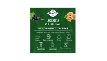 Коллекция натурального кофе Poetti Leggenda — это произведение мастеров кофейного искусства для ценителей качества, изысканного вкуса и аромата. Премиальная 100% арабика собрана вручную на латиноамериканских высокогорьях эксклюзивно для блендов Leggenda. Бленд Leggenda Original из зерен средней степени обжарки с богатыми ореховыми оттенками и нотами темных ягод. Вкус с мягкой шоколадно-ореховой горчинкой, легкой кислинкой черной смородины. Для напитка характерны средняя плотность и длительное послевкусие. Идеален для приготовления кофе в турке, в чашке, френч-прессе, кофемашине, капельной и гейзерной кофеварках. Чашка Poetti Leggenda Original — это наслаждение, к которому хочется привыкнуть! Страна производства Россия