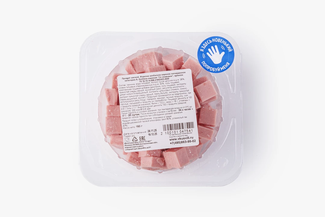 Нежная колбаса из свинины с добавлением цельного молока и сливок обладает мягким вкусом и бархатистой текстурой. Чёрный перец и мускатный орех добавляют ей классическую пряность без излишней остроты. Мы уже нарезали её аккуратными кубиками, чтобы вы могли сэкономить время на приготовлении как повседневных, так и праздничных блюд. Такой вариант нарезки хорошо подходит для салатов или сытной яичницы и омлета на завтрак.